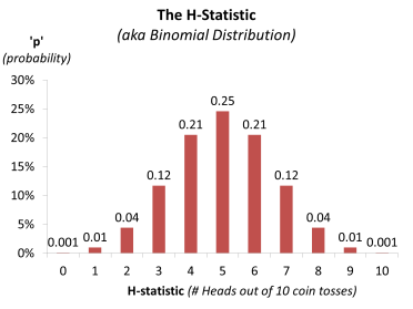 3. The observed result was 9 out of 10 heads. Based on our understanding of the distribution at #2 above, we can all agree this result (9/10) is possible, but pretty improbable assuming the coin, the tosses and the calls are fair (which is our expectation under the null hypothesis). In fact, according, to the distribution (see chart), the probability of exactly 9 heads is 0.01. The probability of 9 or higher (10 heads) is 0.01 + 0.001 = 0.011. The probability of an extreme value of the H-statistic, say nine or more or one or less (for a two-tailed test) is 0.011 + 0.011 = 0.022.