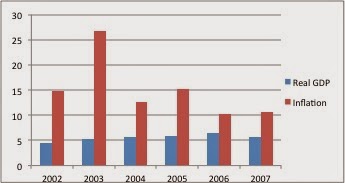 Figure 6 indicates the growth trend in South Africa from 2002 to 2007. As shown in Figure 6, South Africa’s real GDP rose by 3.6% in 2002, 3.1% in 2003, 4.8% in 2004, 4.9% in 2005, 5.3% in 2006, which has been cited as the highest 1981 and 5% in 2007. This growth can be attributed to the effectiveness of the bold macroeconomic reforms that have enhanced competitiveness, employment creation and opening South Africa to the multilateral trading system. The country saw its inflation rate going down from 5.8% in 2003 to 1.3% in 2004 but peak again in 2005 to 3.3% which was due to the primary increase in food prices. All these trends were driven by household consumption, private and public fixed investment on the demand side, financial and business services, construction, and wholesale years and retail trade on the supply side.