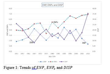 When the ENP is estimated using vote share (instead of seat share), we denote it by ENPv. Note that ENP and ENPv need not be the same, unless vote share and seat share of all parties are the same. However, these two aspects should move in the same direction.
