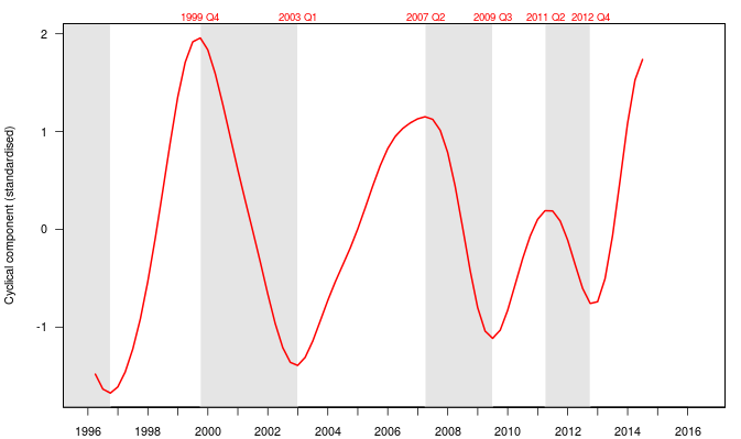 At an intuitive level, the procedure works as follows. First, we remove the trend and focus on fluctuations away from the trend. Second, we remove the high frequency fluctuations (below two years) and the low frequency fluctuations (above eight years). What’s left is in the range of frequencies which are considered `the business cycle’. Third, we identify turning points in this series.