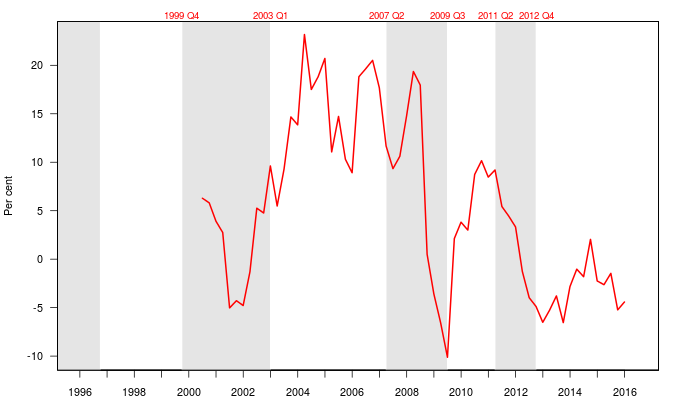 The graph above shows the familiar series of seasonally adjusted annualised growth, of the net sales of non-financial non-oil firms, with shaded bars showing downturns. This series only starts after 2000 as quarterly disclosure by firms only started then. Placing this series (net sales of firms) into the context of the business cycle events gives us fresh insight into both: we learn something about the sales of firms respond to business cycle fluctuations, and we learn something about business cycle fluctuations.