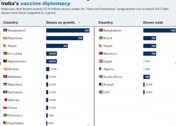 The Indian government has seen this as an opportunity to fulfil its foreign policy goals. With its massive vaccine production capability, India has launched Vaccine Maitri (Friendship). It aims to provide vaccines, at times free of costs as “gifts”, to fellow developing countries. This has earned the country a lot of goodwill in the international community as well as in its neighbourhood where it is battling China for influence. India has already distributed almost 23 million doses of vaccine worldwide to 20+ countries. The external affairs ministry said that it plans to supply vaccines mostly free of charge to 49 countries in Latin America, the Caribbean, Africa and Asia. Indian vaccines are expected to reach CARICOM countries, Pacific Island States, Nicaragua, Afghanistan, Mongolia in the next few weeks. As part of Covax alliance, India would supply Africa with 10 million doses. The country has also recently promised to give UN peacekeepers 200 thousand doses as well.