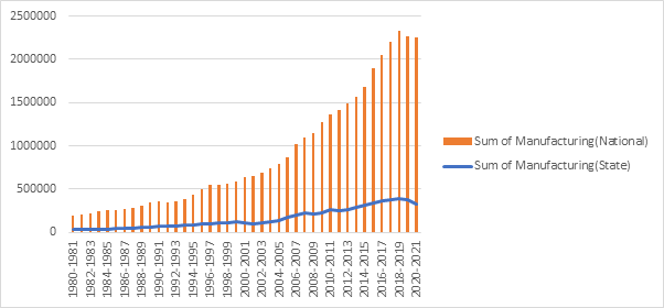As previously stated, there is an observable increase in the manufacturing industry, as seen in the graph above specifically in Maharashtra, following the year 2006. The aforementioned shift can be ascribed to the increase in the number of enterprises initiating their business activities within the state. On the other hand, the manufacturing sector in Maharashtra saw a protracted period of stagnation and inactivity between the years 1980 and 1991. The lack of progress during this period may be primarily attributed to a variety of governmental regulations at both the national and state levels, which imposed limitations on the expansion of the industrial sector.