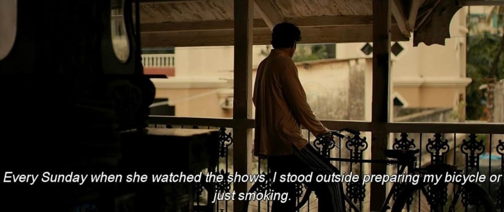 Even the visual architecture of Mumbai becomes an archive in this film. Mr. Fernandes’ reflections offer a melancholic catalogue of what remains and what has vanished: “The old houses of the boys I used to play with as a child are gone now. My old school too. But some things are still the same. The old post office, still there and the hospital where I was born and where my parents died, and my wife.” – (54:50-55:15)